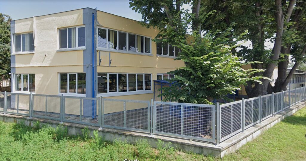Az épület előtt négyszögméternyi sík, zöld mező szolgál a gyermekeknek játszó- és tornatérül.